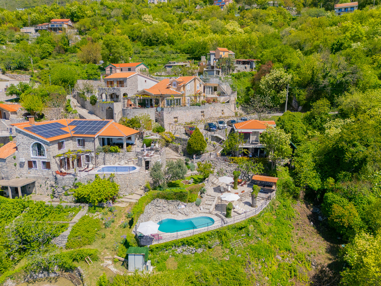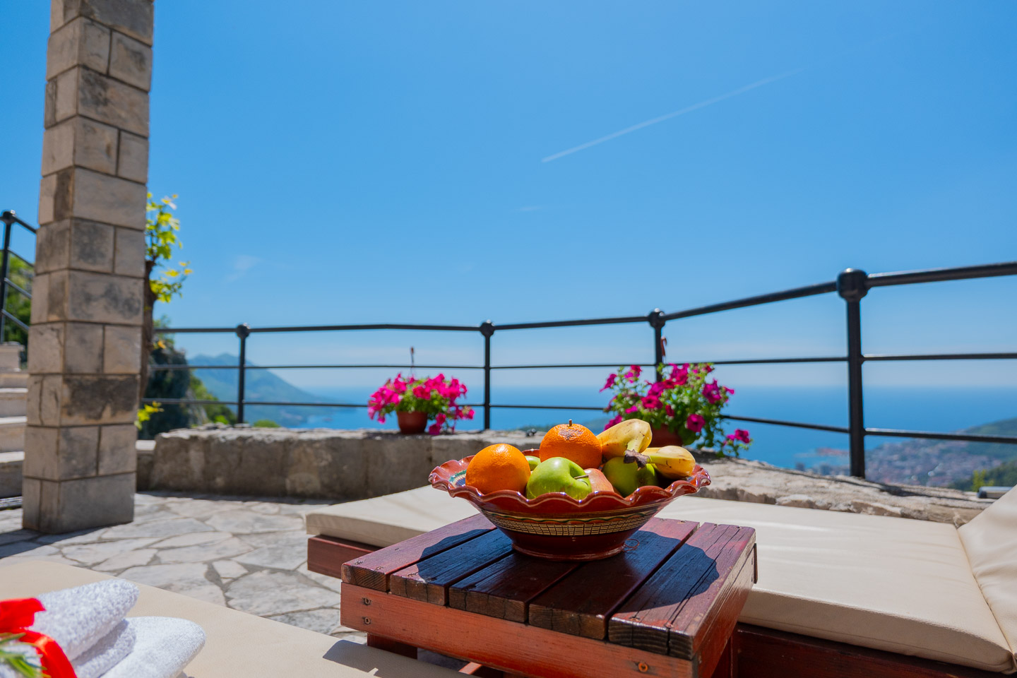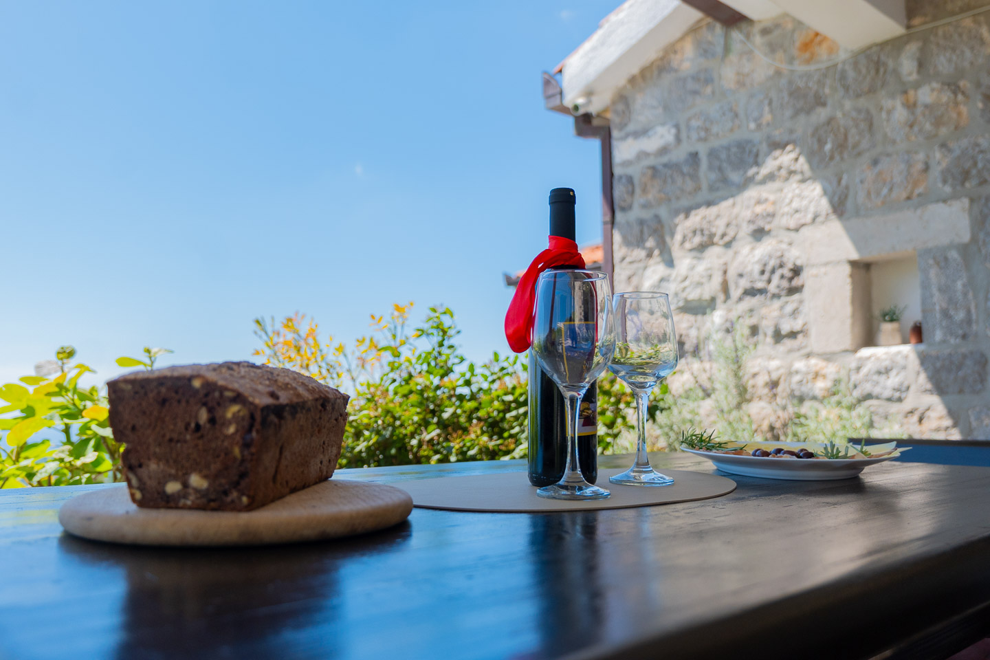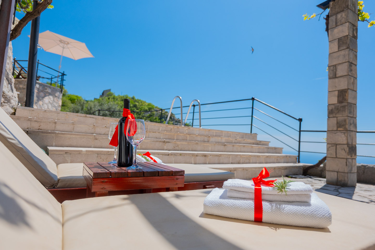 The exterior of the villa is just as impressive — a large terrace with a heated pool, surrounded by grapevines and natural stone details, creates the perfect space for sunbathing, socializing, and enjoying the sea view. It is equipped with sun loungers, a lounge area, and an outdoor barbecue, making it ideal for open-air dinners. Guests have access to free Wi-Fi, air conditioning, a TV, a fully equipped kitchen, private parking, as well as services such as car rental and organized transfers. Overall, Villa Rustique provides an intimate, comfortable, and inspiring environment that is hard to find on this coastline.